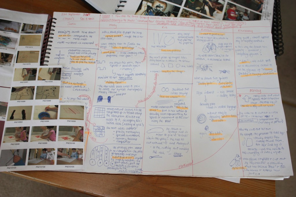 At Ashmore Park Nursery School, Wolverhampton, UK documentation is collected in group learning journals, and are brought to the weekly pedagogy meeting together with examples of children’s drawings or clay work so that multiple educators can read the documentation, make sense of it, discuss and contest it and come to an inter-subjective re-reading of the documentation. From this point, plans are then made in how best to offer future situations of learning, or generative contexts that enable children to evolve their thinking and the construction of knowledge as part of a group. It is the pedagogical documentation itself (the notes, photographs, dialogue) that are collected in the moment with the children that becomes the tools in which learning is debated and given shape and visibility. It is these in the moment notes that are also used directly with the children, serving as a memory of their previous learning. When the group documentation is used in this way it fosters a strong sense of a learning group identity.