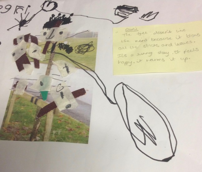An example of this was with a group of children aged 3-5 at Woodlands Primary and Nursery School, Telford, UK In identifying with a tree within their environment, children expressed a deep sense of empathy with the tree, giving it human characteristics and applying what they knew about being safe and secure to the needs of the tree. In doing so, they said that the tree had a family, a mother, a father and a grandmother. and that it had feelings. What at first appeared like a fantastical and imagined idea of the children turned out with further research to hold truths in it; revealing that the forest floor, sometimes referred to as the world wide wood, was indeed a place of relationships, where some trees acted like parents to other trees, sheltering them and coaxing them to grow. It was important in this scenario to find out more about the relationships of trees, not only to fuel our learning but as to be able to listen more closely to the evolving ideas of the children working together as part of a group. There was also the shared inquiry of the educators as to how children developed a sense of empathy with living things. This inquiry was a central act of the research of the teachers into children’s learning processes and acted as a driver for project work on an ecological theme.
